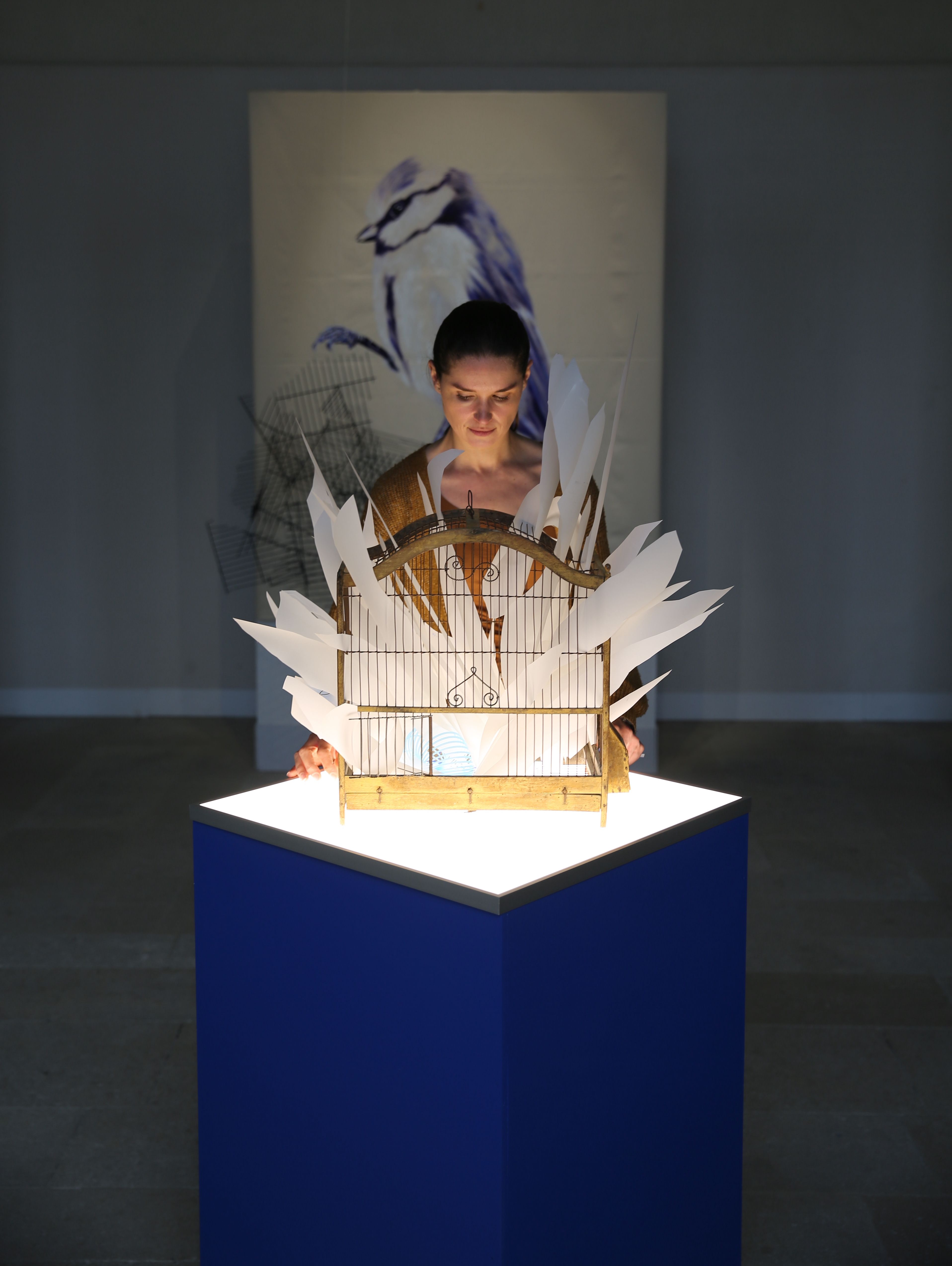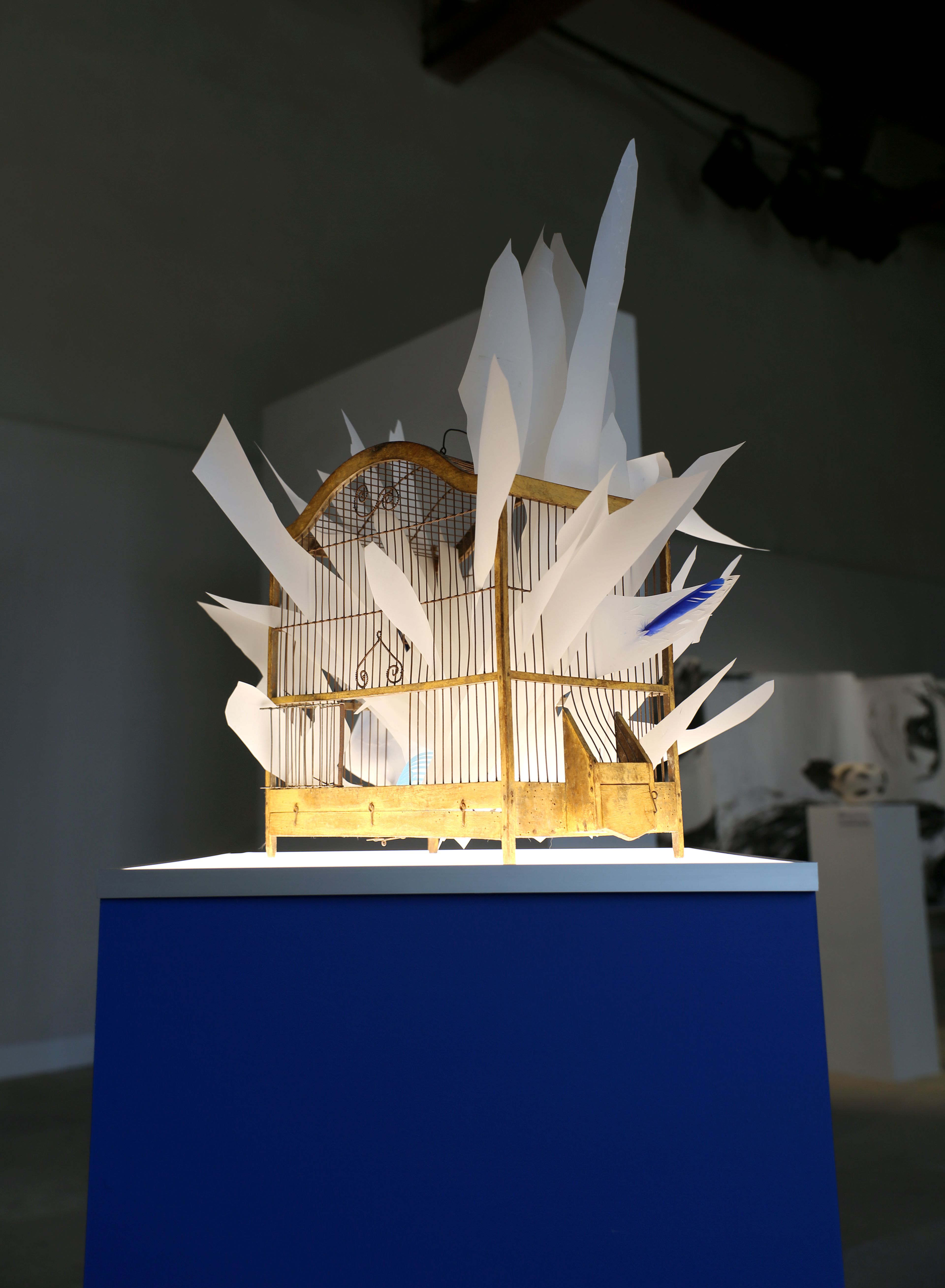 Salle d'attentes - 2023. Jouets, papier, cage, dispositif lumineux. 60 x 60 x 160 cm