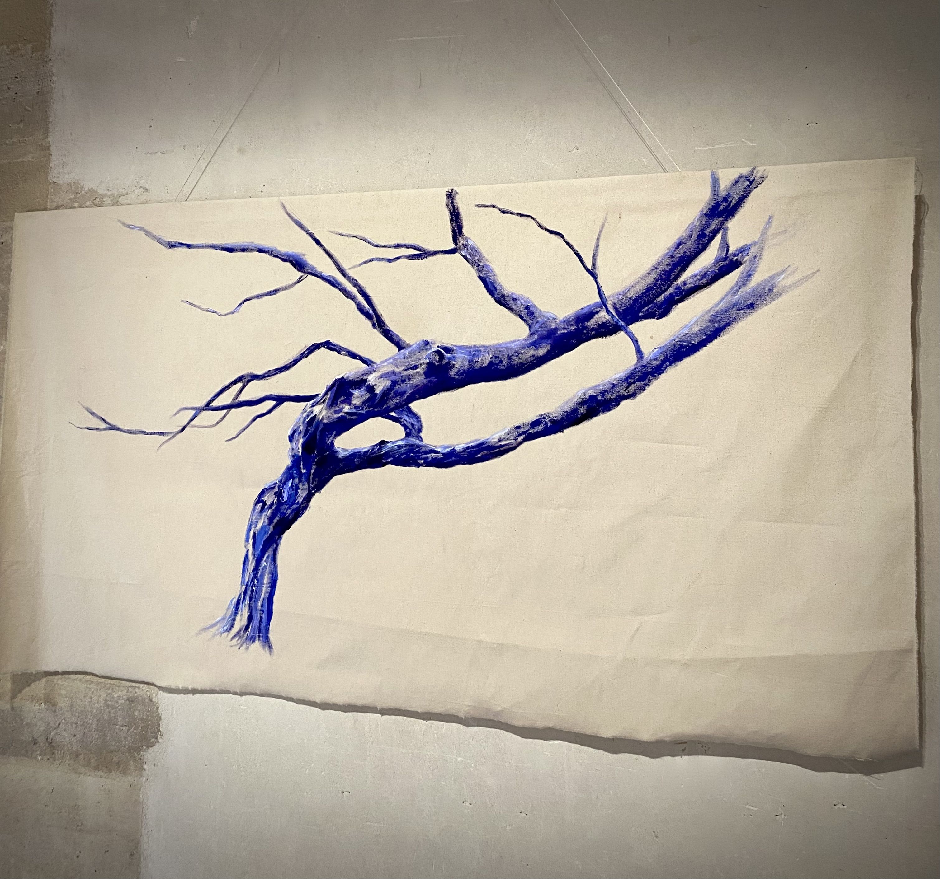 La toile de coton se pare de fils de broderie et de peinture acrylique dans un camaïeu de bleus dans une unité de teintes.